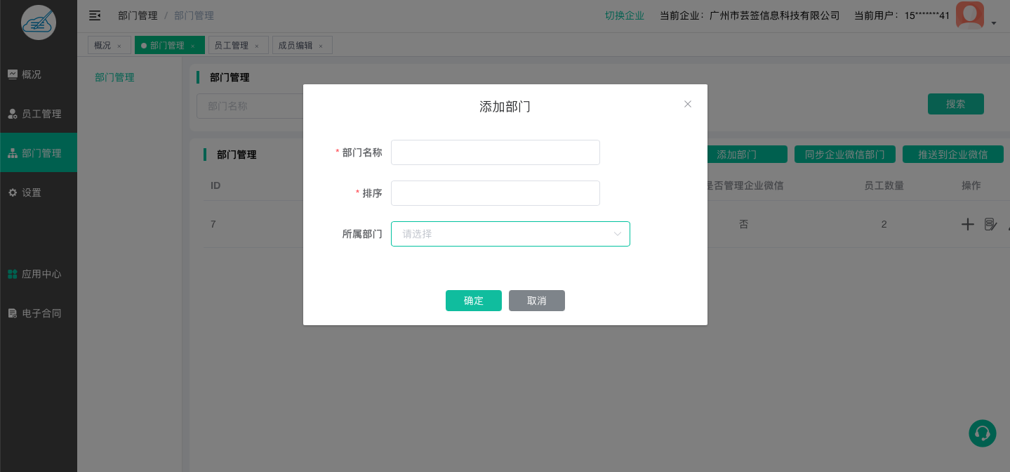 注意:在这里添加的员工并未授权合同模版及企业印章,要授权相关权限操作请到【电子合同】–【模版管理】和【印章管理】里面去授权!