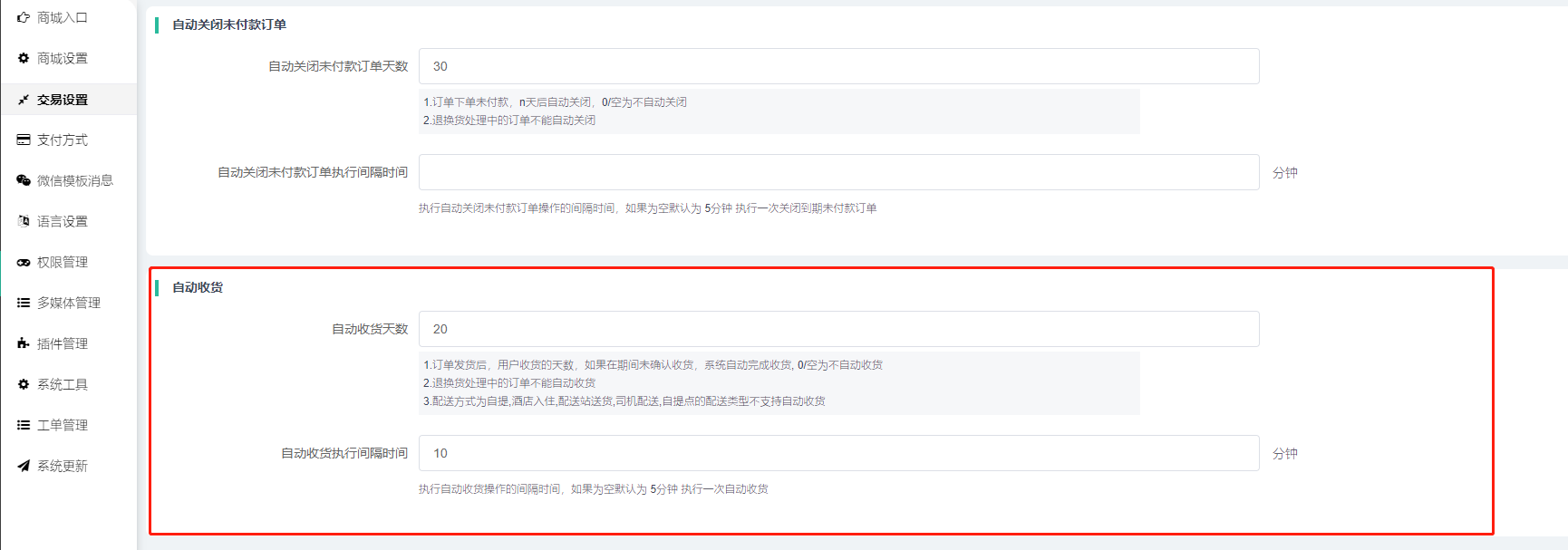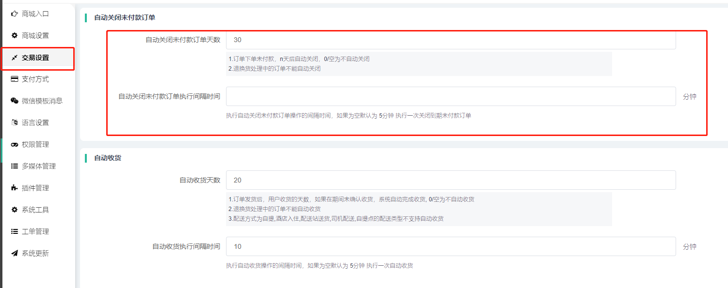 1)自动收货天数:设置订单发货后,用户收货的天数,如果在期间未确认收货,系统自动完成收货,空为不自动收货; 审核中的退款退货申请、换货申请,或换货成功的订单等这些不会自动收货。