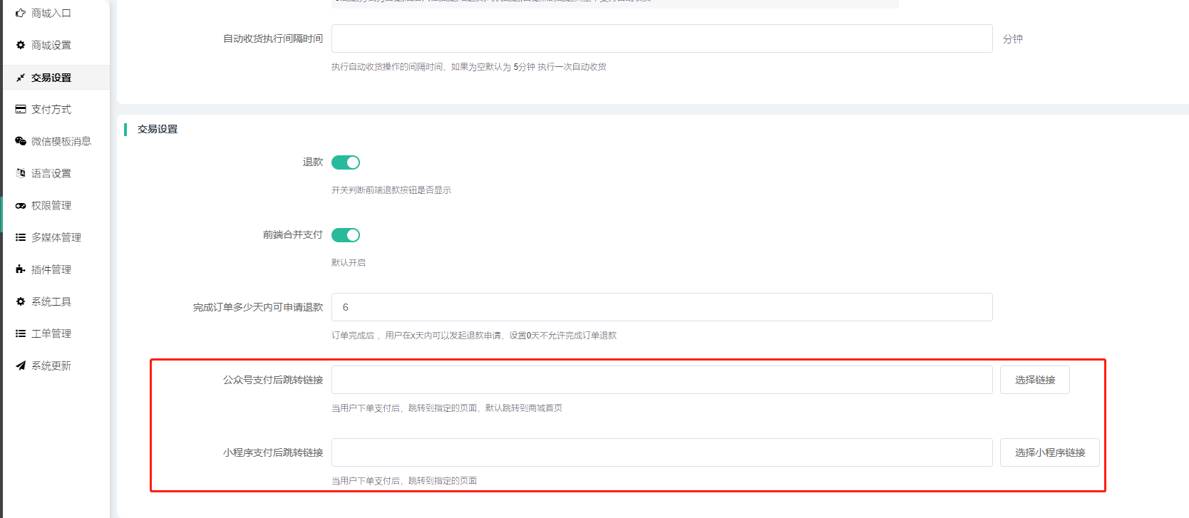 4)公众号支付后跳转链接、小程序支付后跳转链接:当用户下单支付后,跳转到指定的页面,(公众号:默认跳转到商城首页)