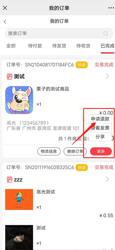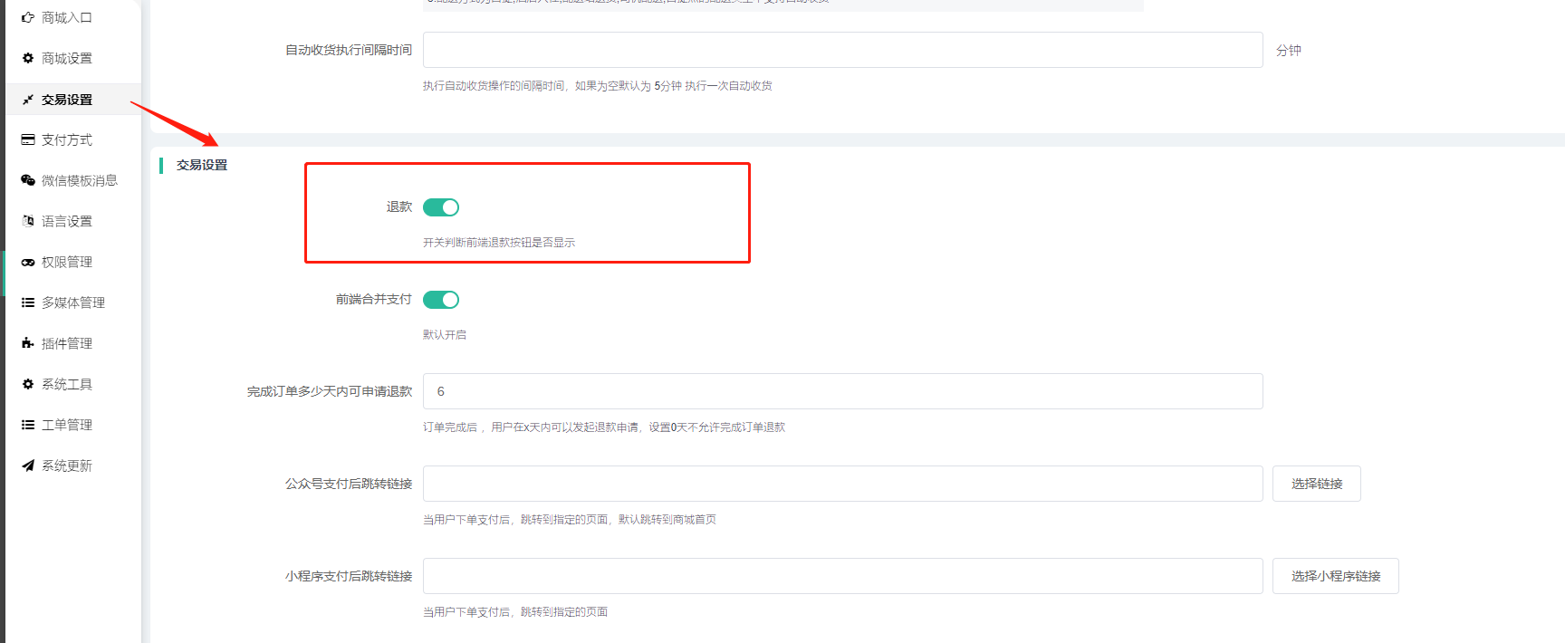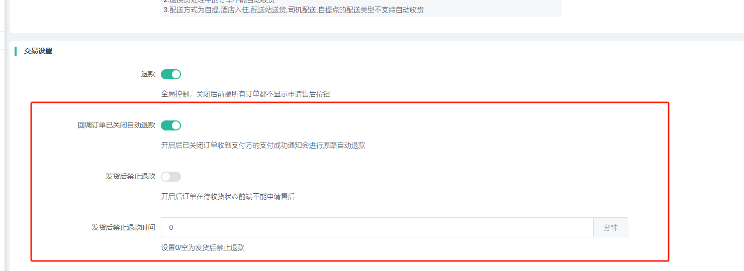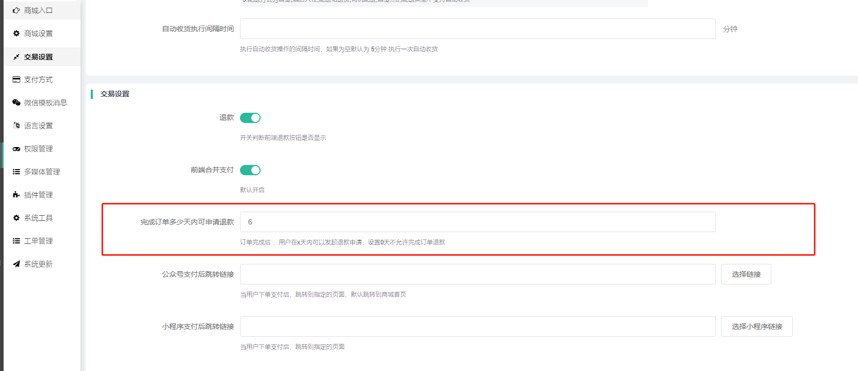 3)完成订单多少天内可申请退款:设置订单完成n天内可发起退款申请,如果设置0则不允许完成订单退款。