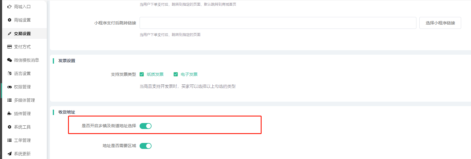 5)收货地址:开启乡镇及街道地址选择,系统默认显示省-市-区(县)三级地址选择,如果开启这个选项,支持让用户选择乡镇/街道。