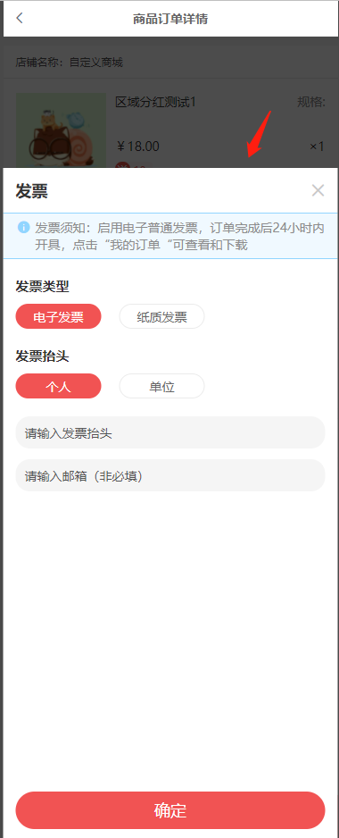 下单后,如果选择电子发票,商家可以在商城后台订单详情中可以上传发票。