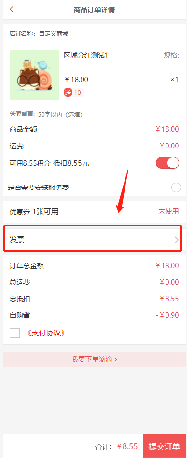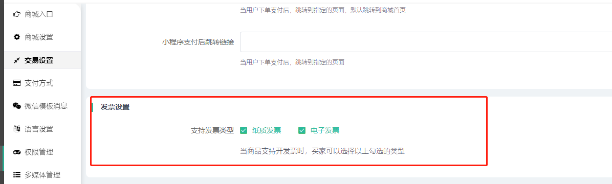 4)发票设置:后台勾选开启后,买家前端下单需要开发票,可以选择勾选对应发票类型;—— 特别注意:现在发票插件已上线,要使用发票功能,需要授权安装发票插件并开启配置发票信息。