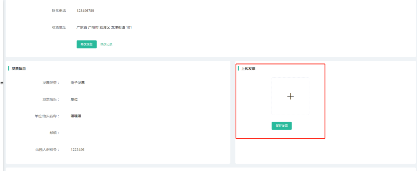 上传后用户在前端–会员中心–订单管理—订单列表中查看发票信息。