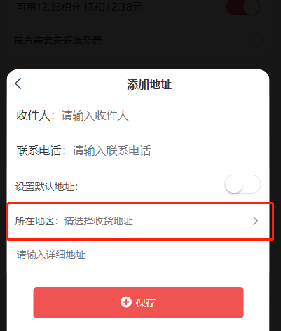 6)地址是否需要区域:开启后,地址可以选择区域,关闭则不需选择,开启前端效果显示如图: