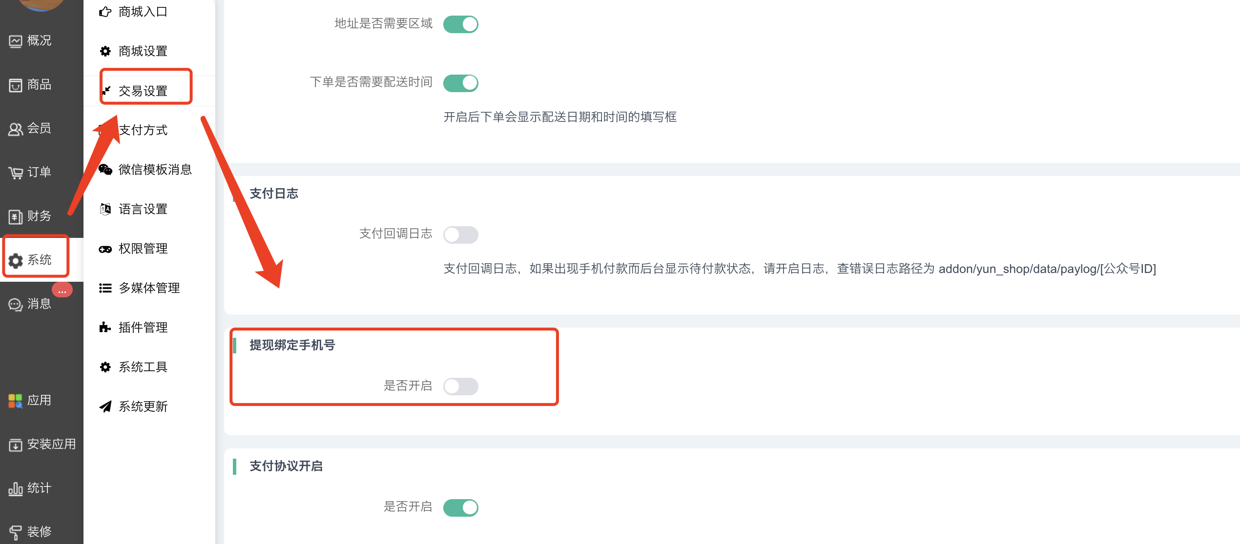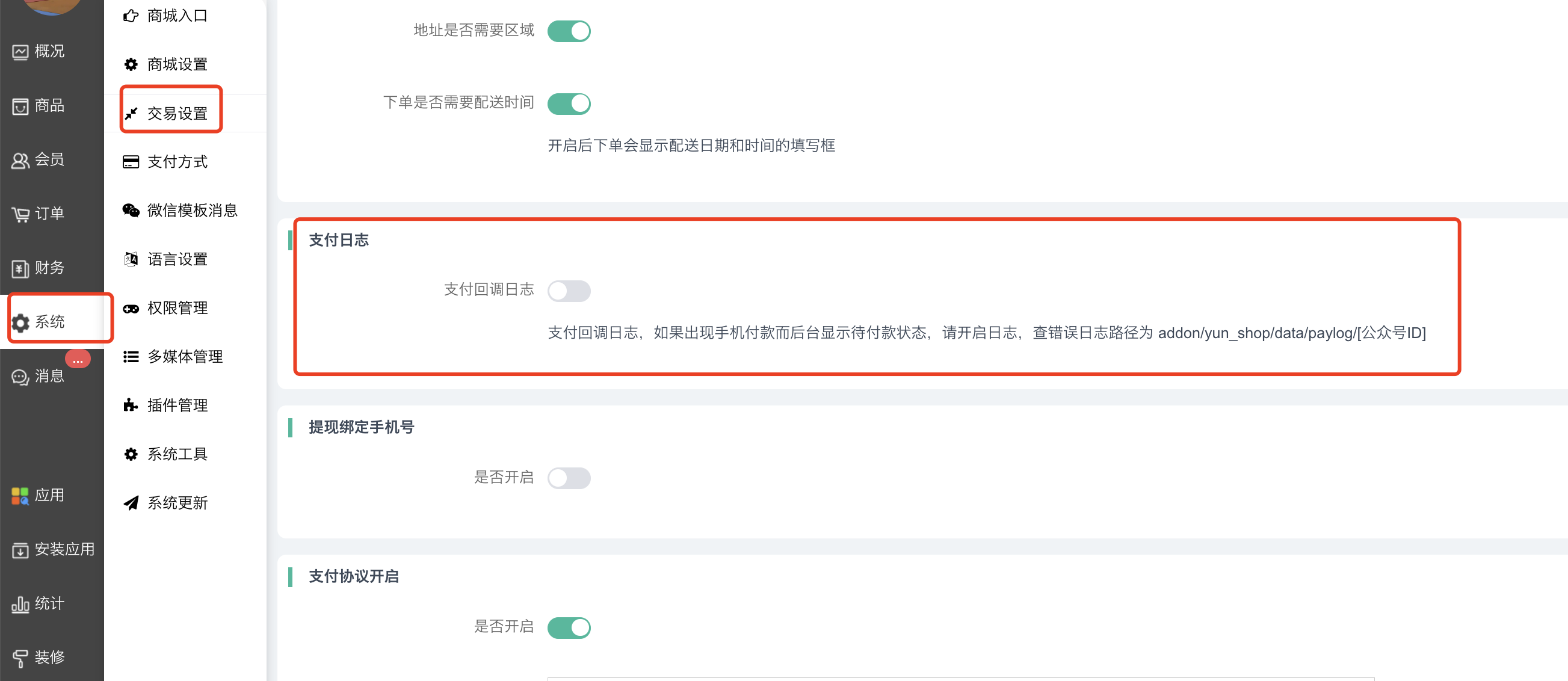 7)支付回调日志:支付回调日志,如果出现手机付款而后台显示待付款状态,请开启日志,查错误 日志路径为:addon/yun_shop/data/paylog/[公众号ID]