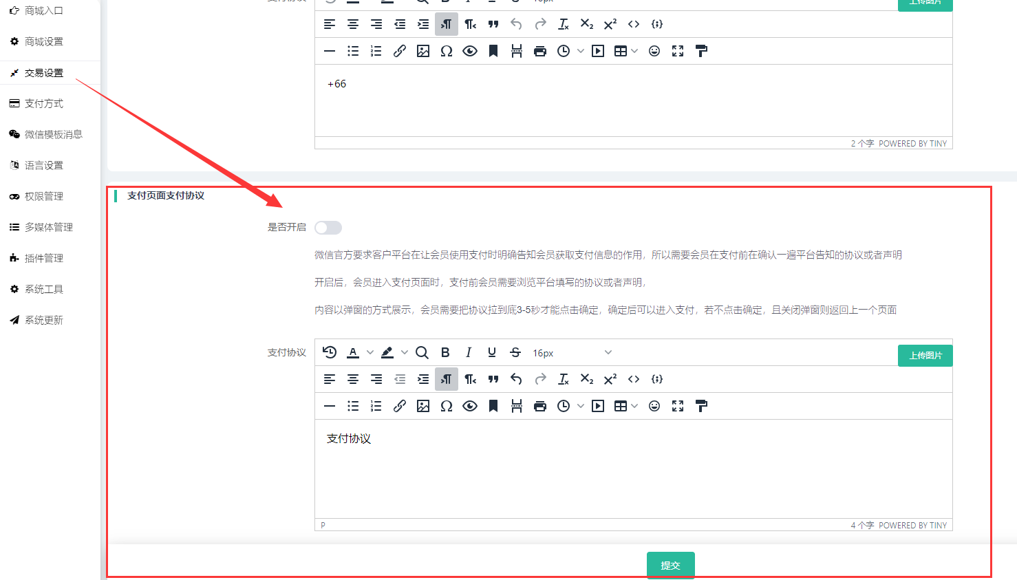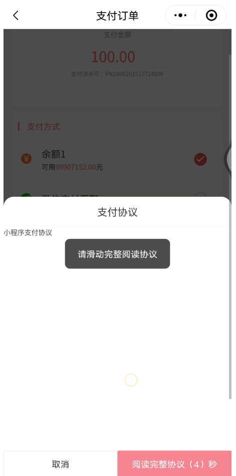 开启后前端进入订单支付页面会先弹出支付协议弹窗