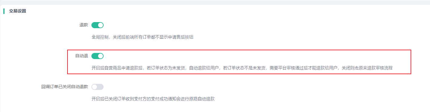 开启后自营商品申请退款后,若订单状态为未发货,自动退款给用户,若订单状态不是未发货,需要平台审核通过后才能退款给用户,关闭则走原来退款审核流程