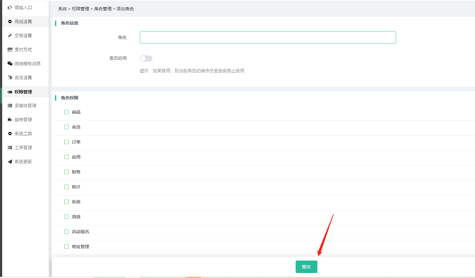 定义商城的角色,可以理解为公司的岗位,比如财务;赋予财务岗位指定的后台操作权限(1)添加新角色给该角色勾选相对应的商城权限,勾选好权限后,记得点击提交保存。