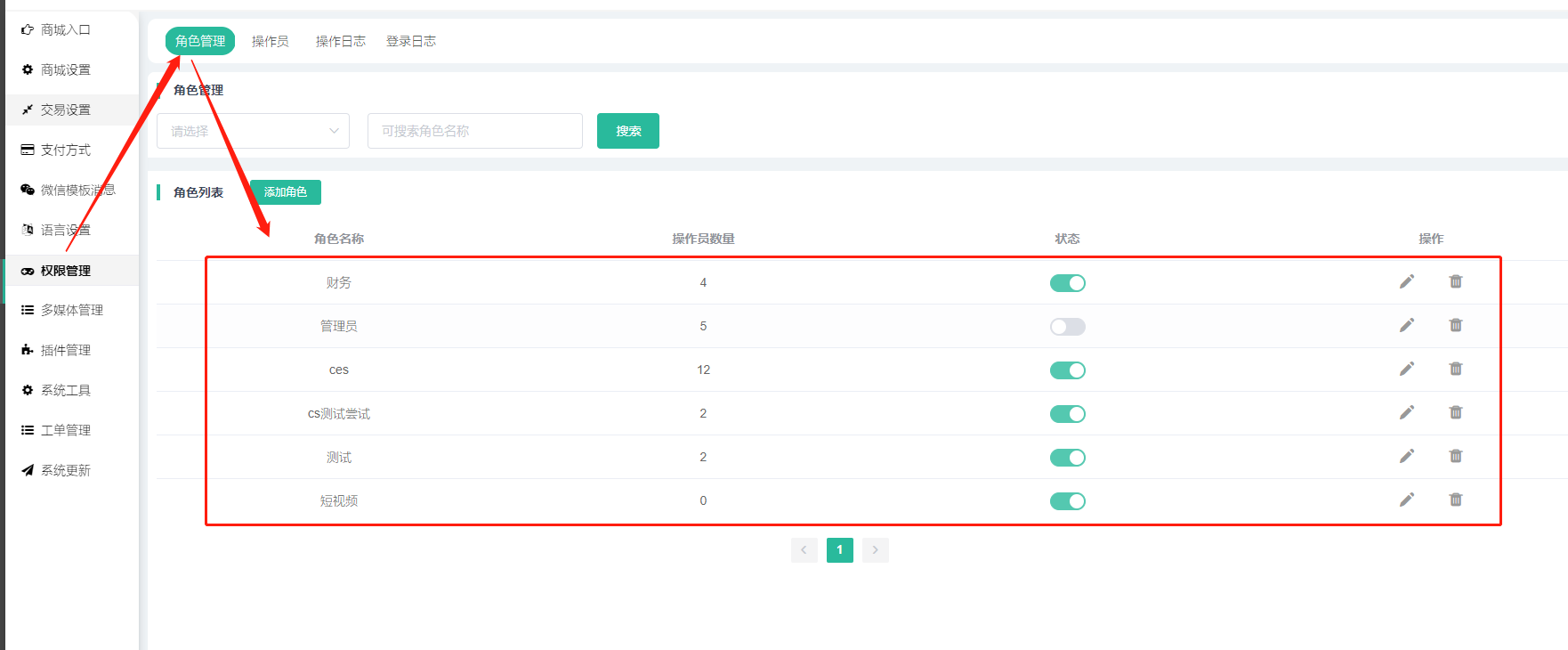 (2)角色列表记录每一个角色名称、操作员数量、状态、编辑角色权限、删除角色