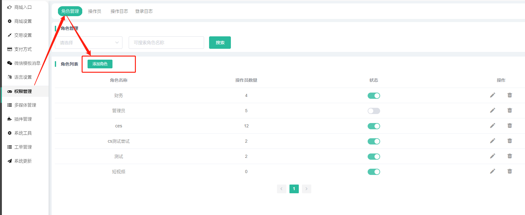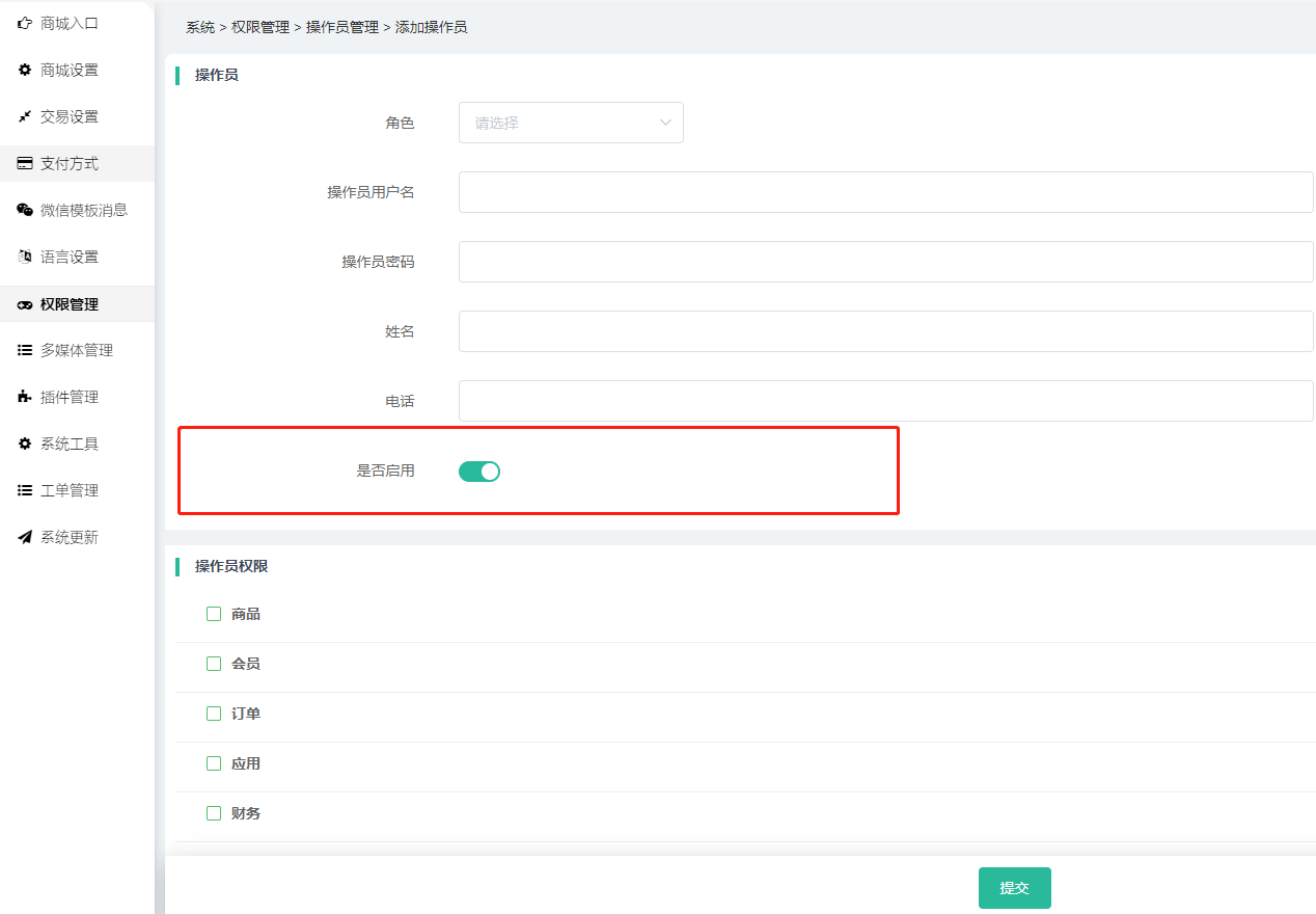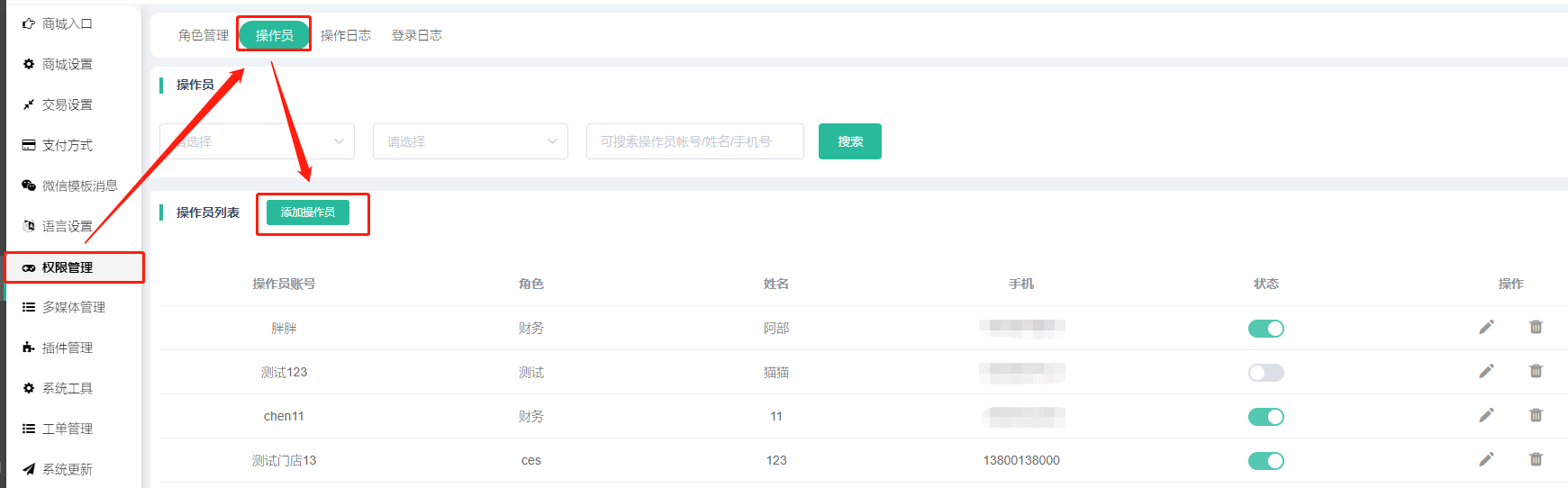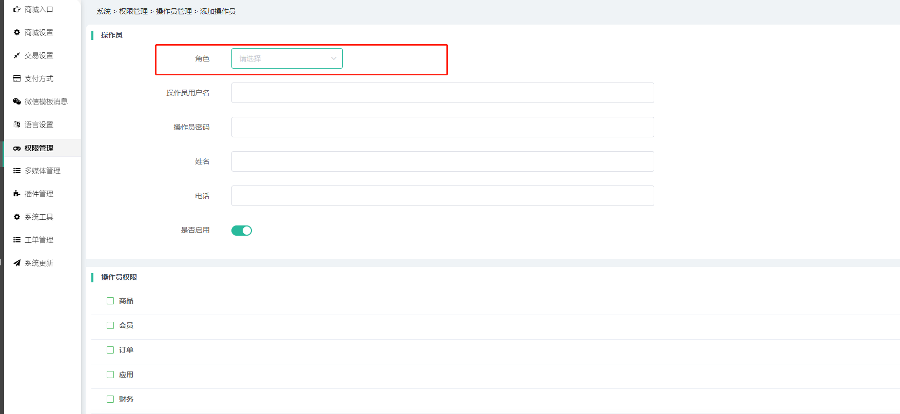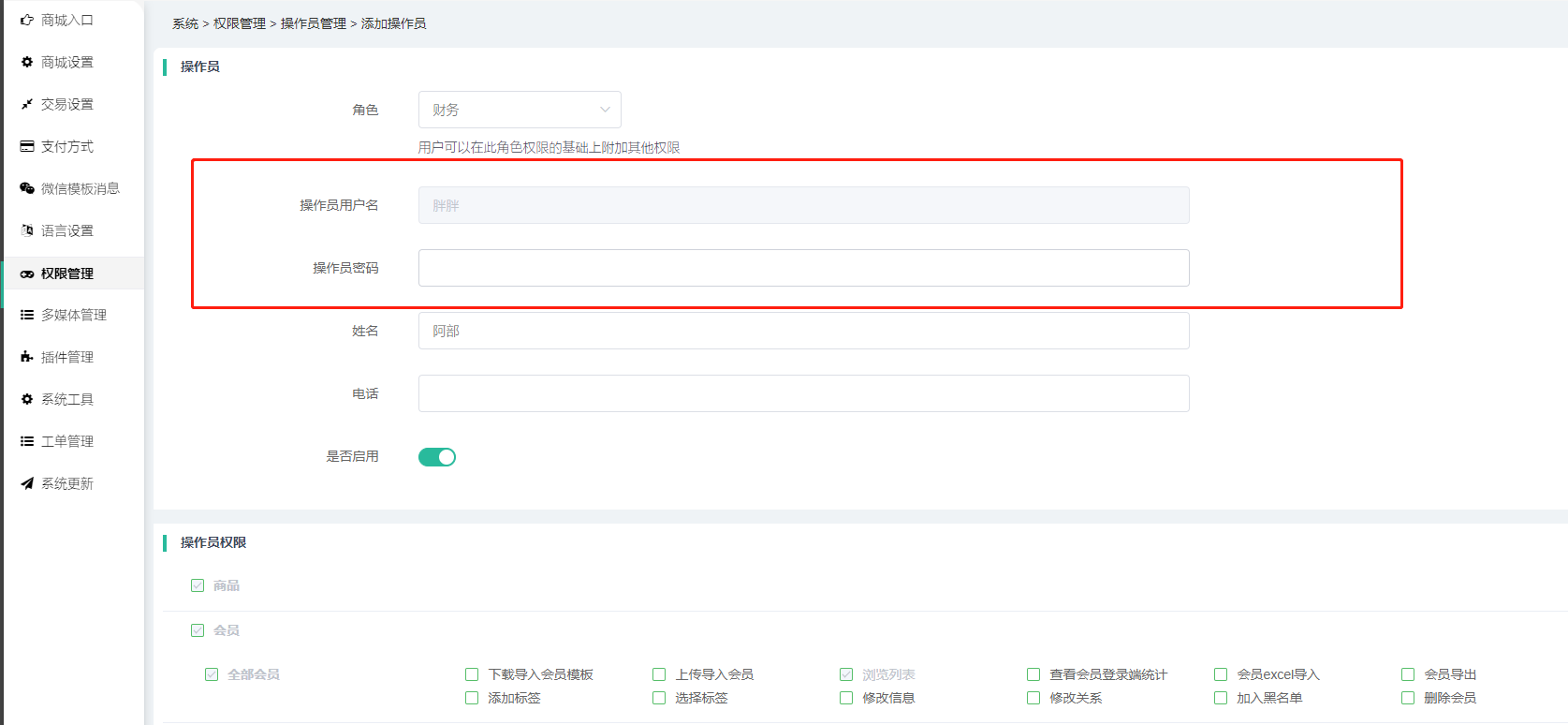 设置操作员,可以指定为某种商城角色,也可以单独赋予操作权限。1、添加/管理操作员