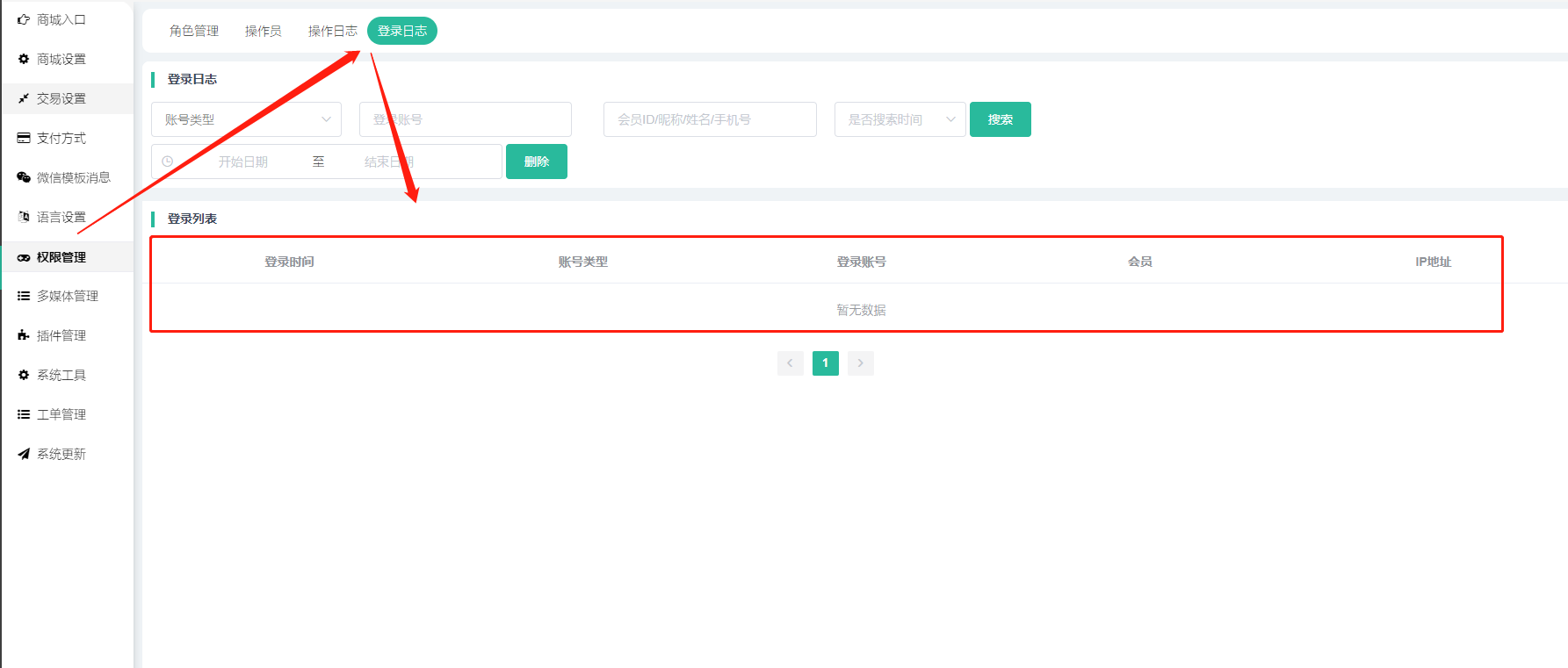 通过登录日志,商家可以查看系统的每一个账号的登录记录,通过登录日志,商家可以查看账号的登录时间、账号类型、登录账号、对应会员、ip地址;(注意:第三方框架的话没有该功能,不会有日志产生)
