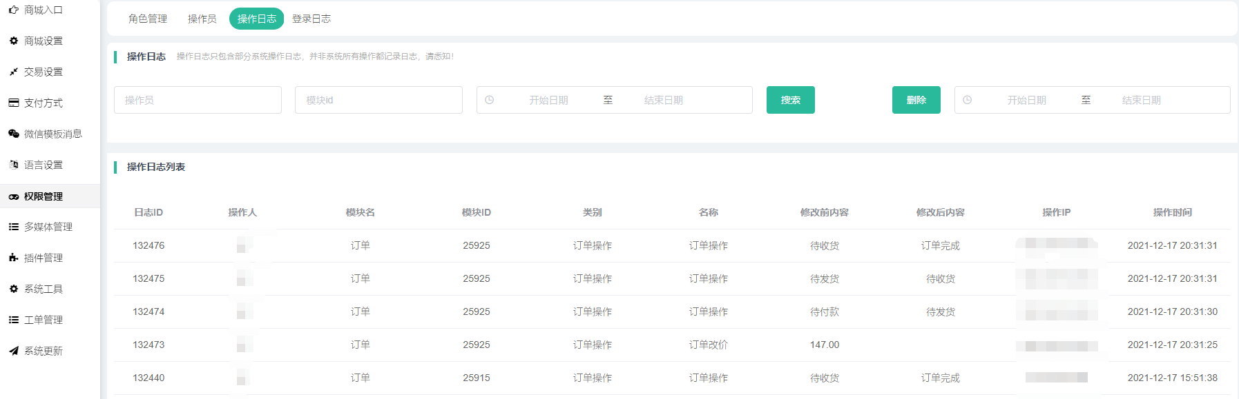 商城后台新增操作日志的功能,通过操作日志,商家可以查看系统的每一条操作记录,通过操作日志,商家可以查看的记录有:
