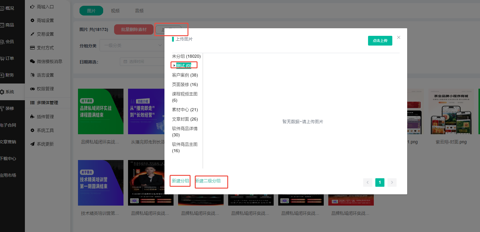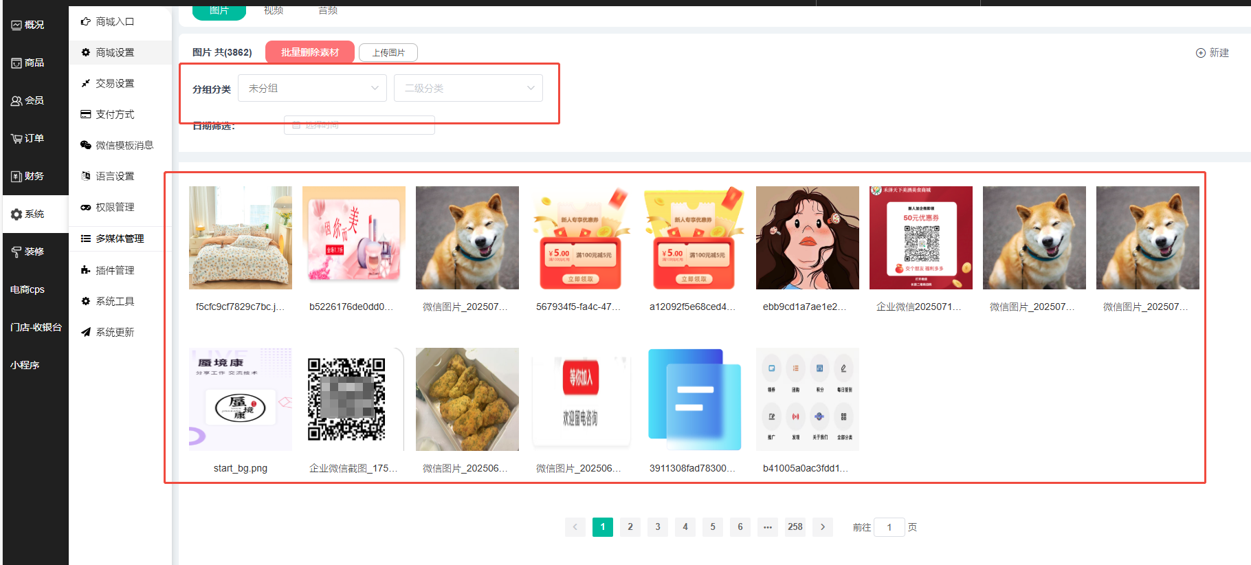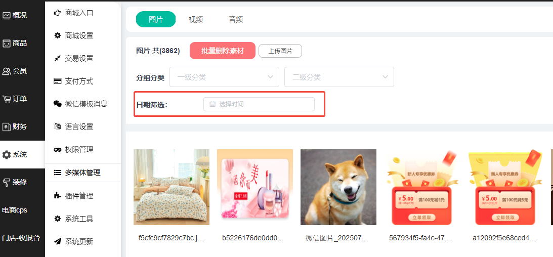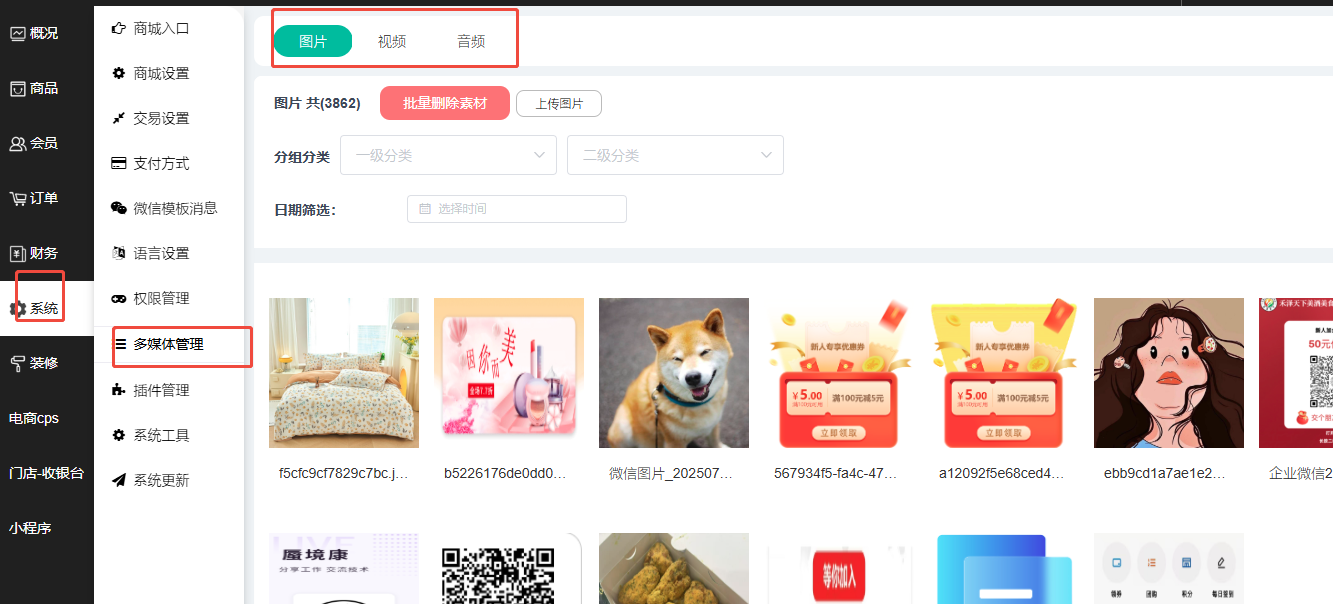 1、多媒体管理这里可以查看商城上传的图片、视频和音频;可选择一级分类、二级分类进行筛选,未筛选下方默认显示所有图片