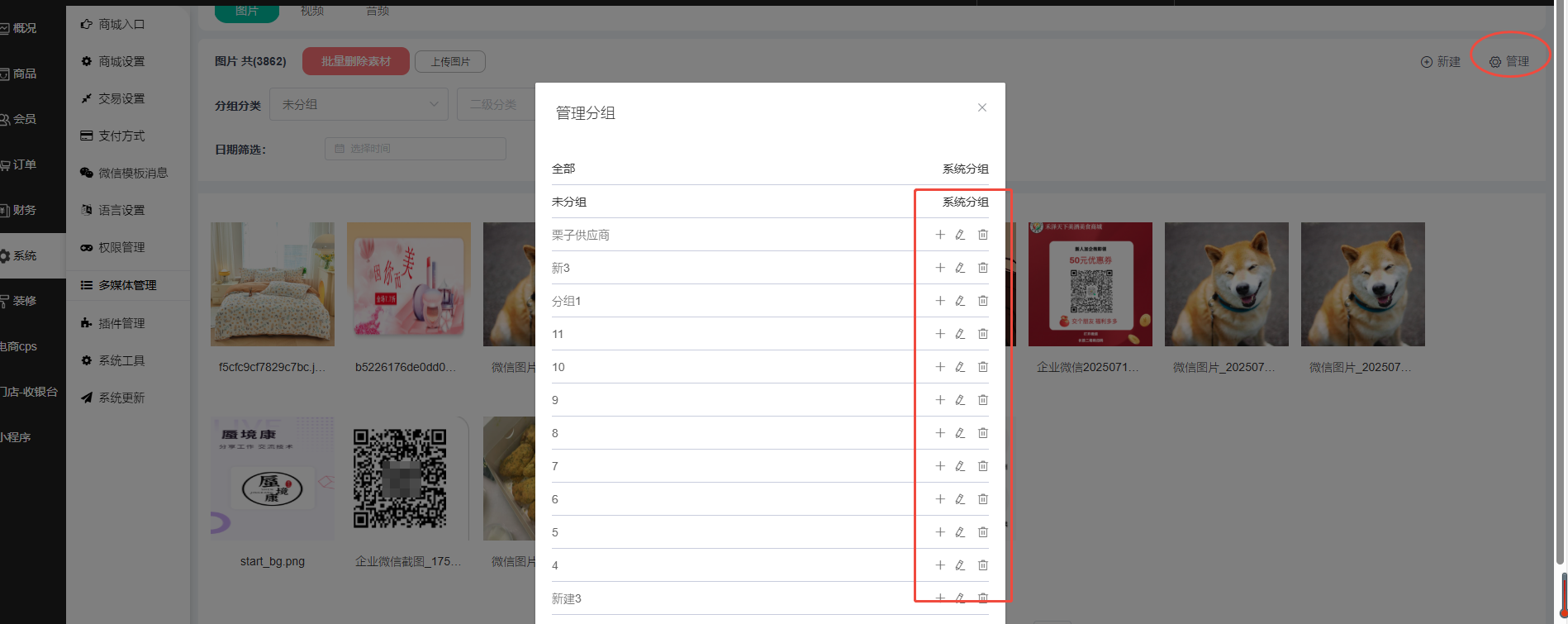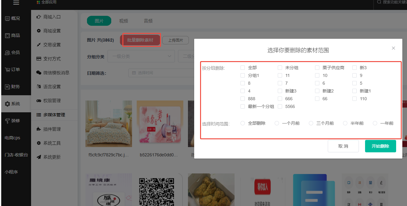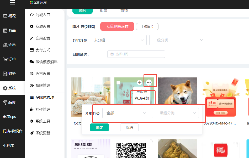 1、多媒体管理这里可以查看商城上传的图片、视频和音频;可选择一级分类、二级分类进行筛选,未筛选下方默认显示所有图片