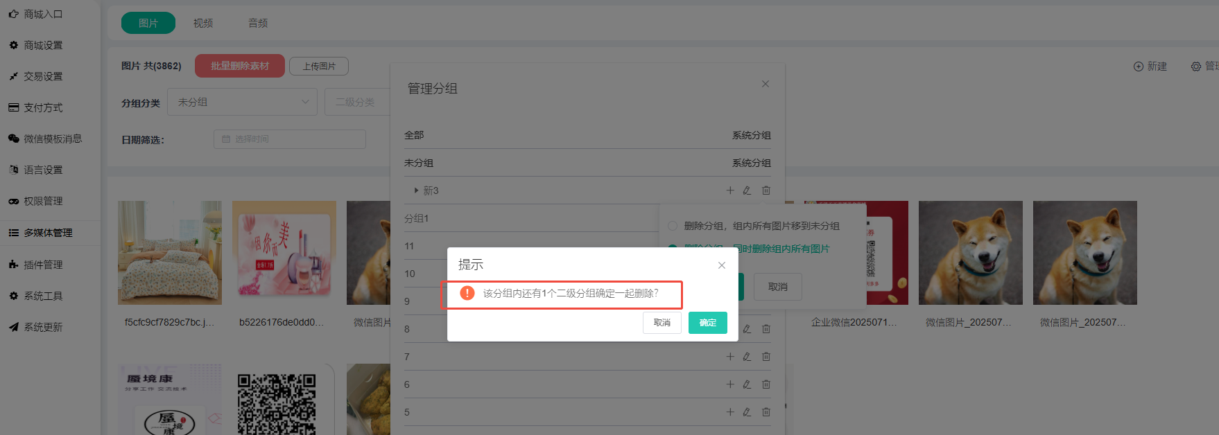 选择删除分组时,当要删除的分组内还有二级分组时会出现确认删除弹窗,这个是选择“删除分组,同时删除组内所有图片确定”才会出现的二次确认弹窗