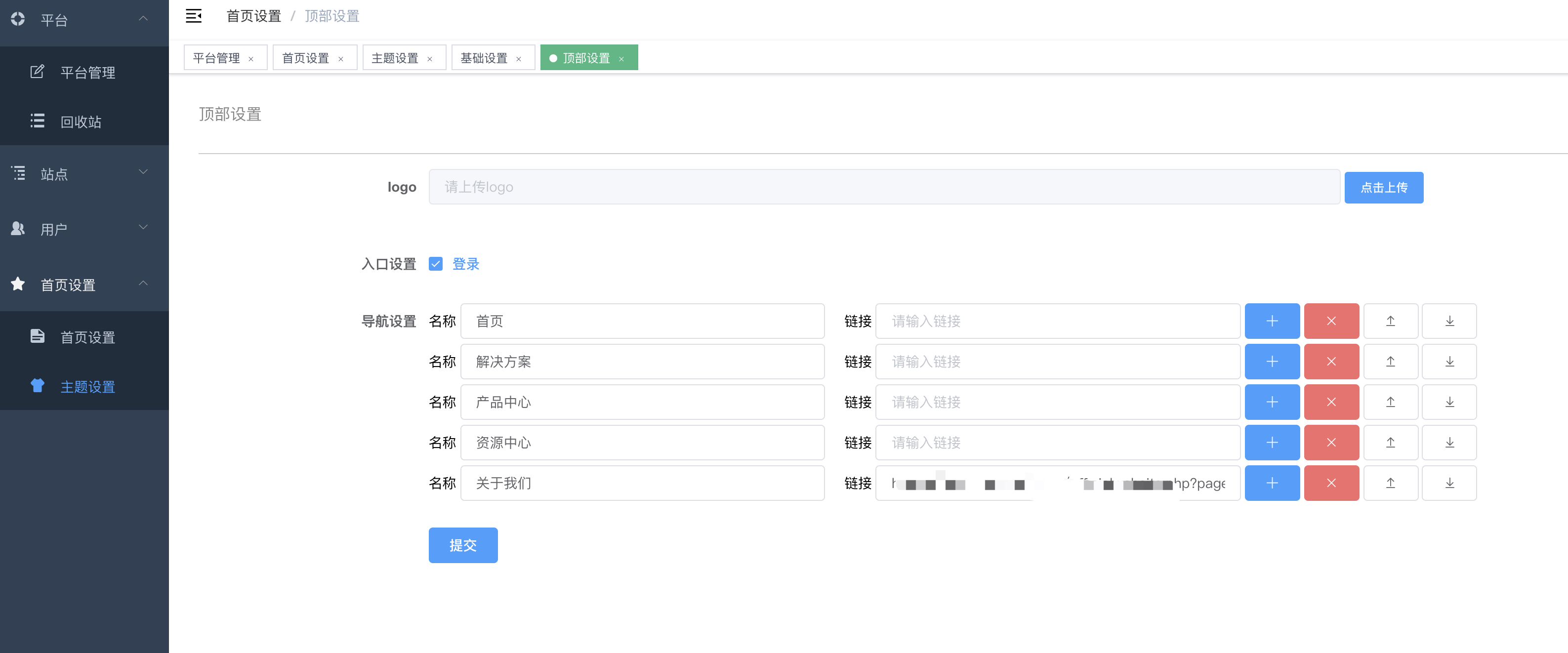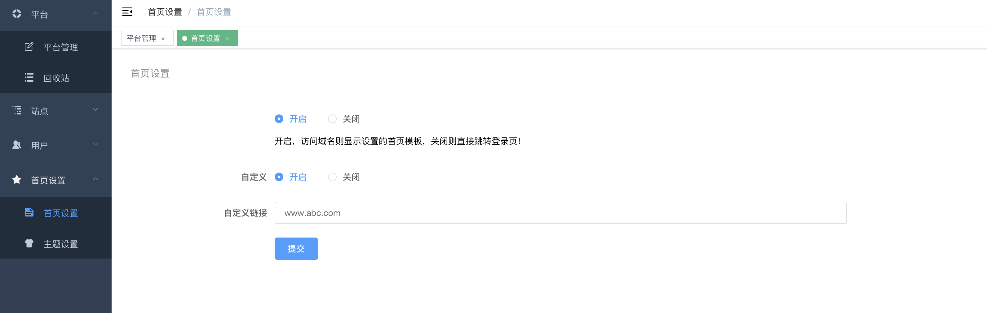 支持设置访问站点域名,如www.abc.com 跳转到指定的页面或者显示指定的首页模板;