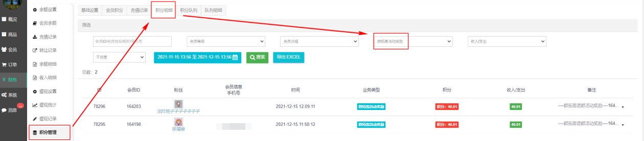 财务—积分管理—积分明细—业务类型:增加“群拓客活动奖励”