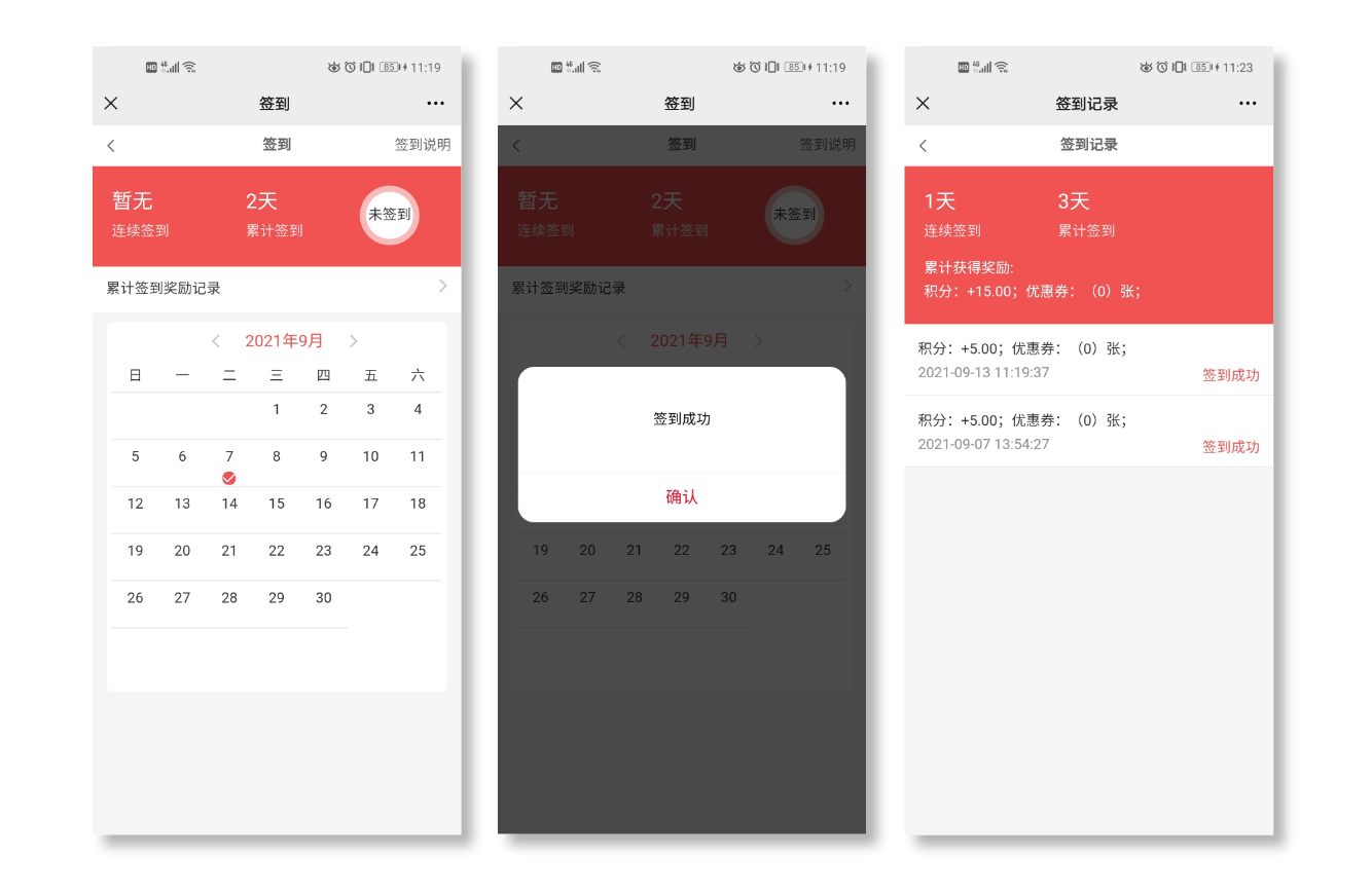 (1)签到一天送2积分,连续签到5天可获得20积分奖励,500积分+10元可兑换30元话费慢充商品券。