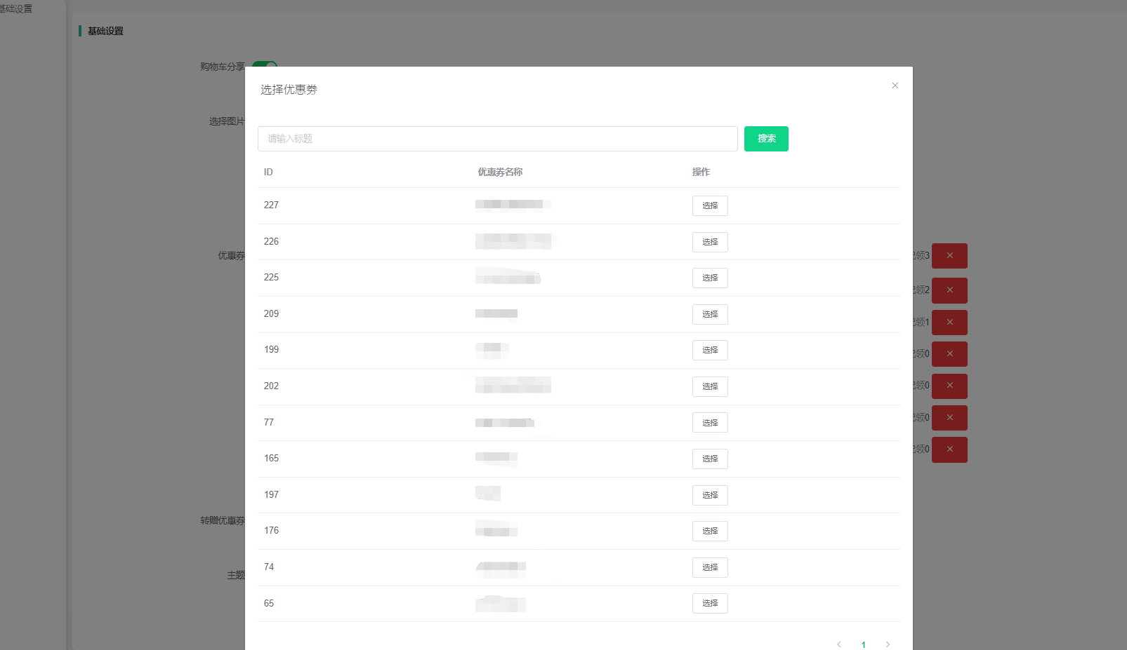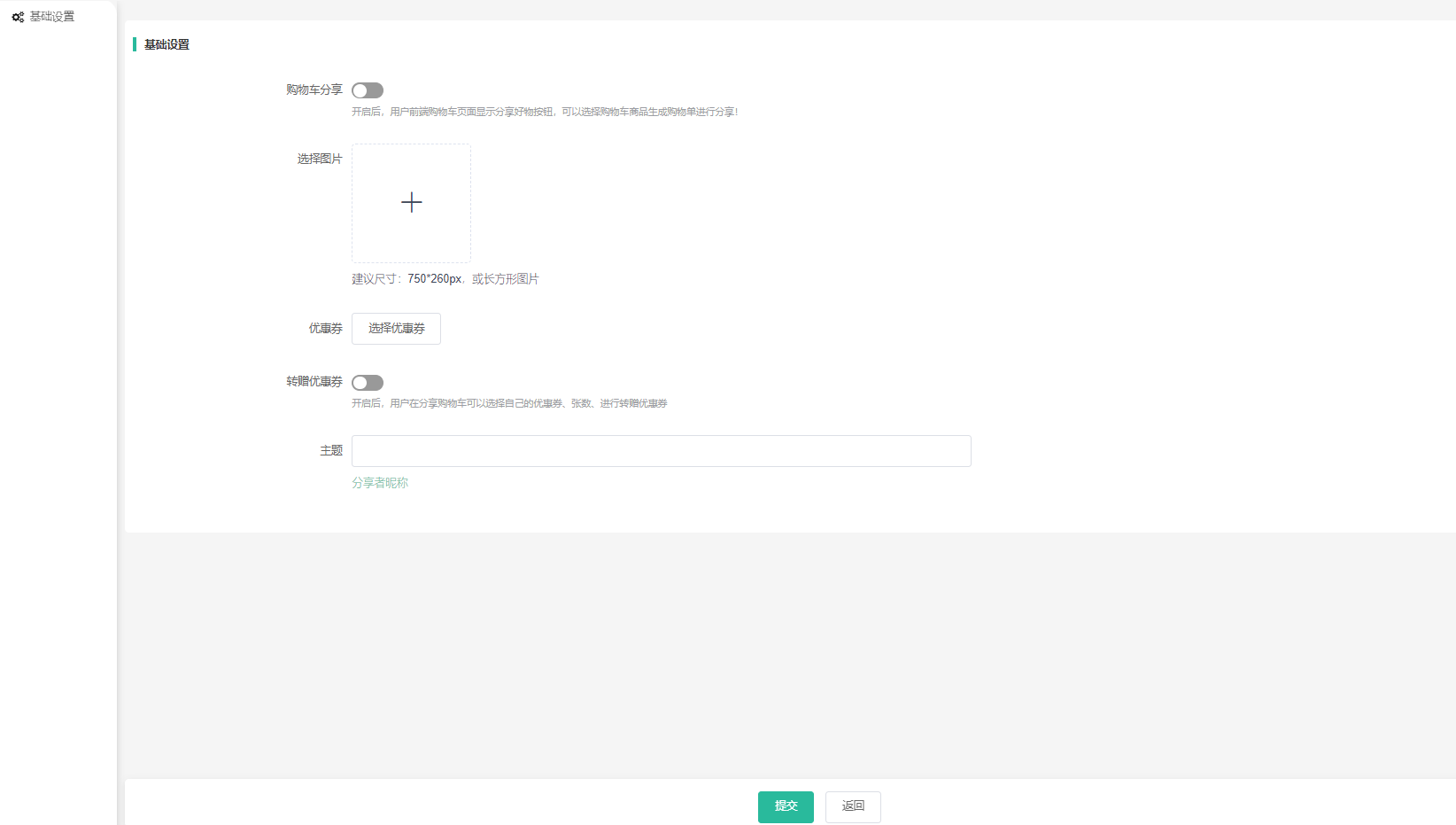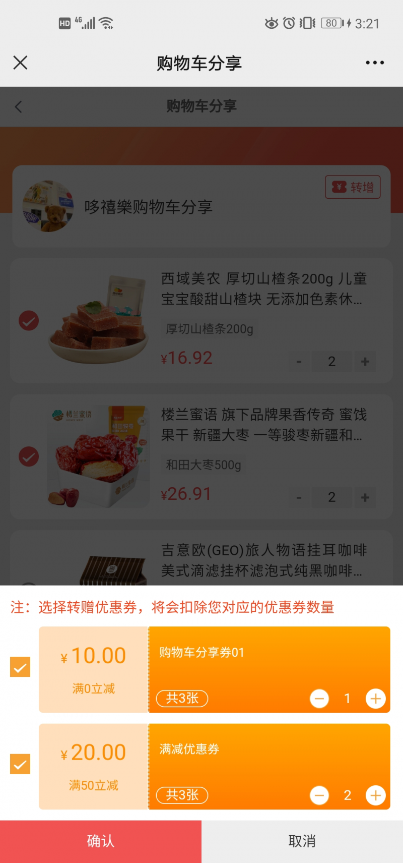 转赠优惠券:开启后,用户在分享购物车可以选择自己的优惠券(会员自己领取的所有平台优惠券)、张数、进行转赠优惠券