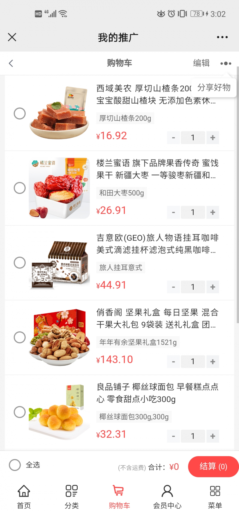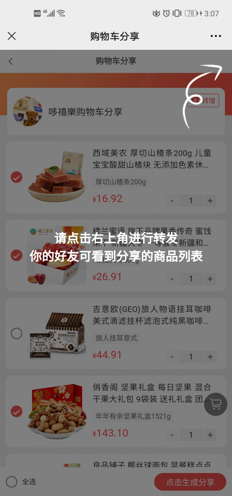 2、点击右上角-分享好物。后台不开启购物车分享则不显示此选项。