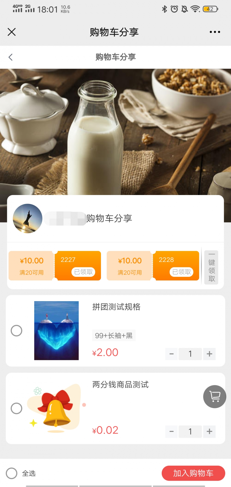 会员A选择购物车商品生成推荐清单,转发给会员B,会员B进入清单页面,可一键领取优惠券,并从中选择喜欢的商品加入自己的购物车。支持H5+小程序端。