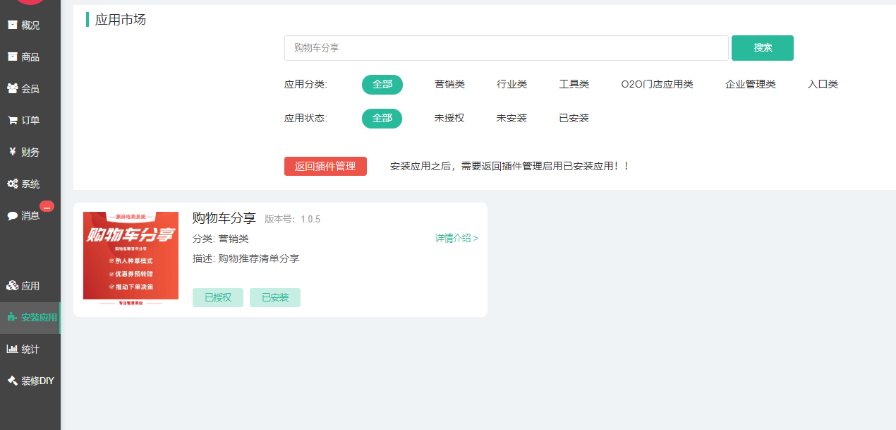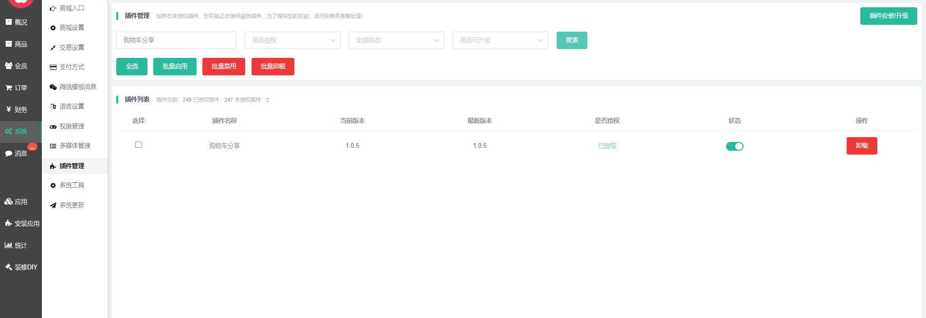 启用路径:总后台 — 系统 — 插件管理 –启用“购物车分享”插件