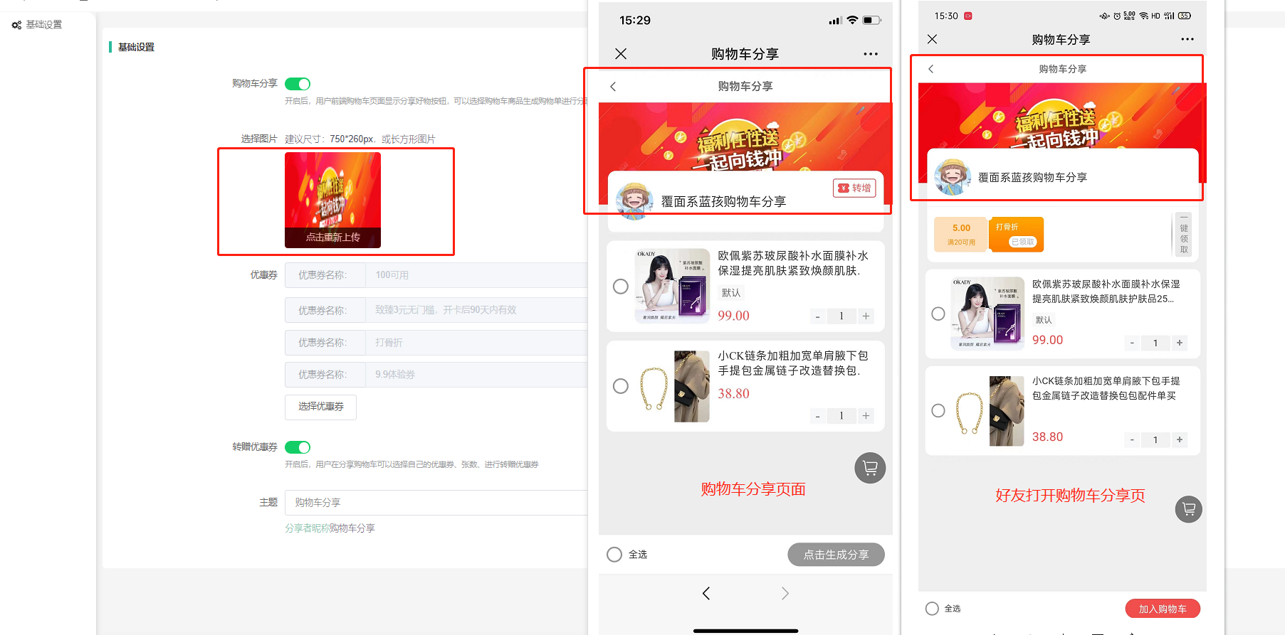 购物车分享:开启后,用户前端购物车页面显示分享好物按钮,可以选择购物车商品生成购物单进行分享!
