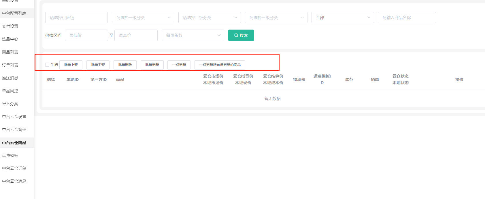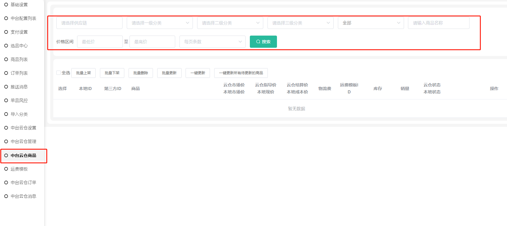 1.可按供应链/商品分类/商品名称/价格区间,设置每页商品条数,对中台云仓商品搜索查看