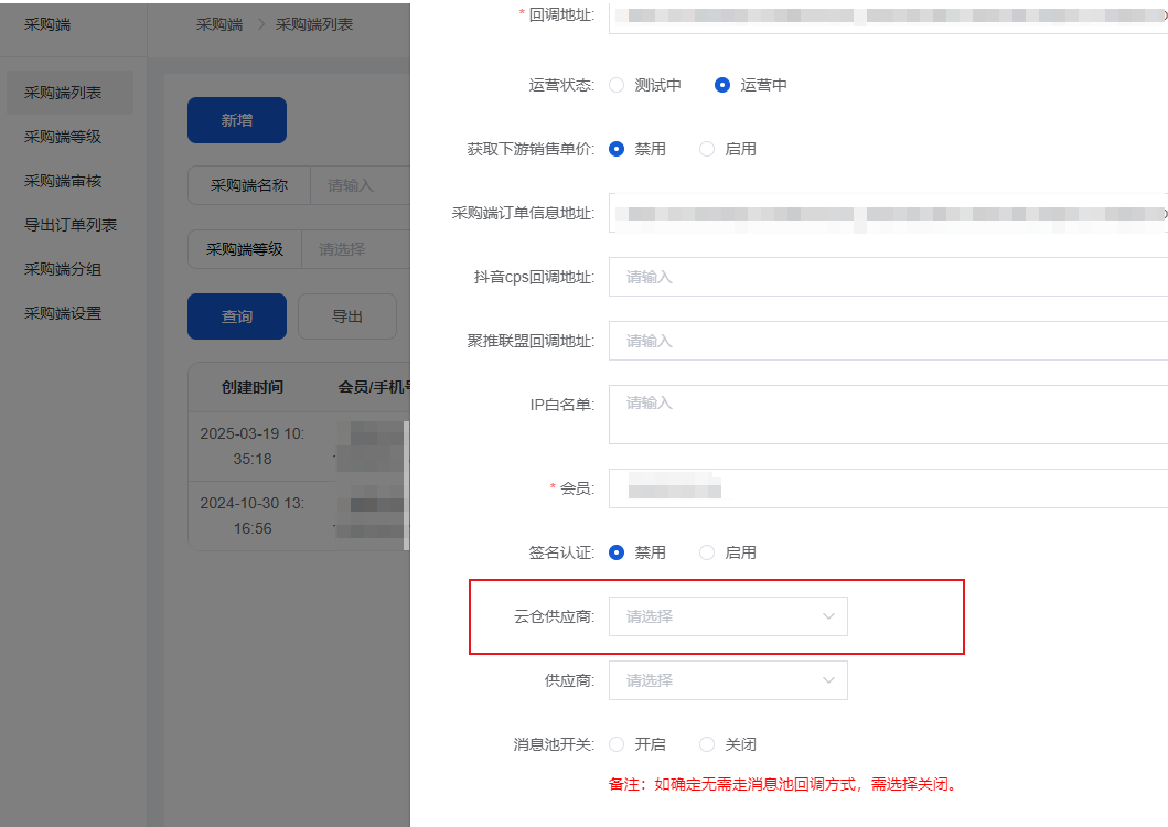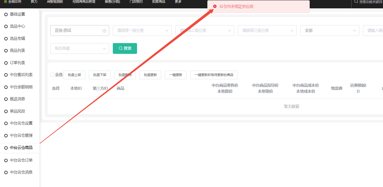 点击中台云仓商品提示:云仓尚未绑定供应商——这个需要到中台–采购端–编辑–绑定供应商,这个是商城推送商品到中台的,要成为中台的供应商,然后采购端绑定供应商才可以使用,若目前是对接使用芸信中台的,可不用这个云仓功能.