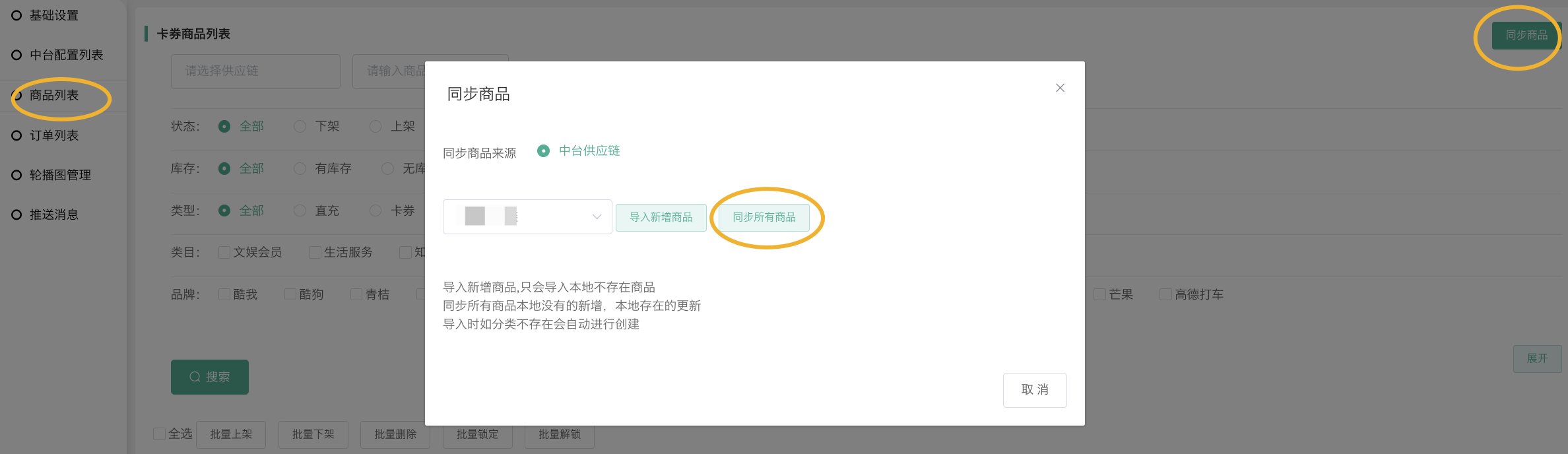 1)点击“同步商品”,可以选择供应链或者聚合cps,导入供应链/聚合cps的卡券商品,导入时,可以选择 导入新增商品同步所有商品