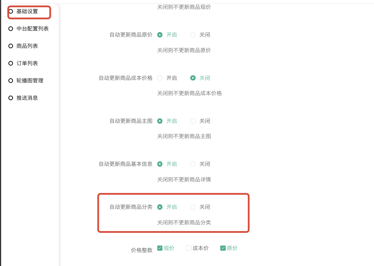 可设置开启更新商品现价,商品原价,商品成本价,商品主图,商品基本信息,开启后,第三方有更新相关商品信息的,可自动推送更新。若关闭则不会自动更新;